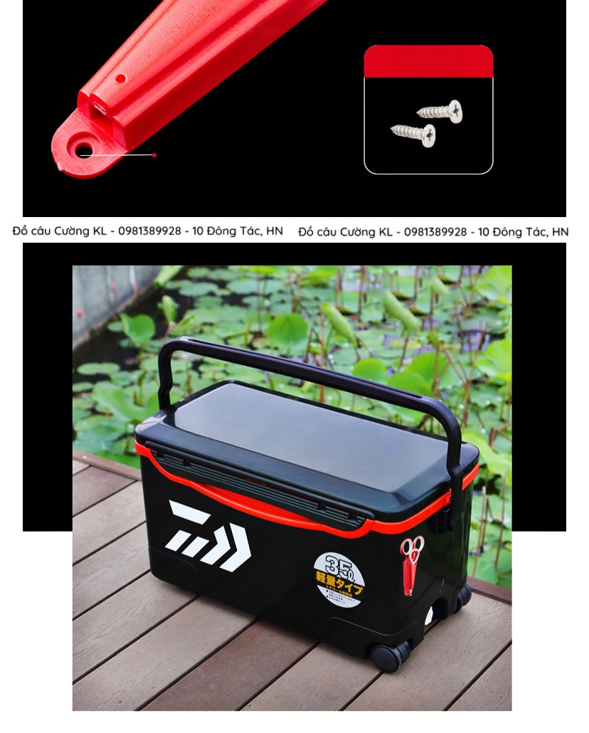 Bộ kéo gắn thùng với hai mầu nổi bật xanh và đỏ đi kèm gỡ cá có thể gắn vào thùng giúp các cần thủ sử dụng dễ dàng