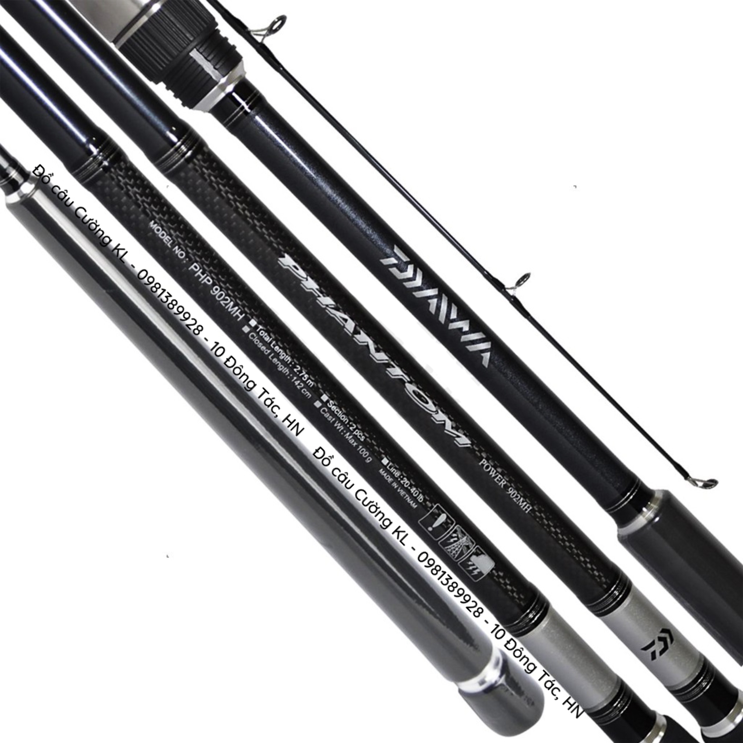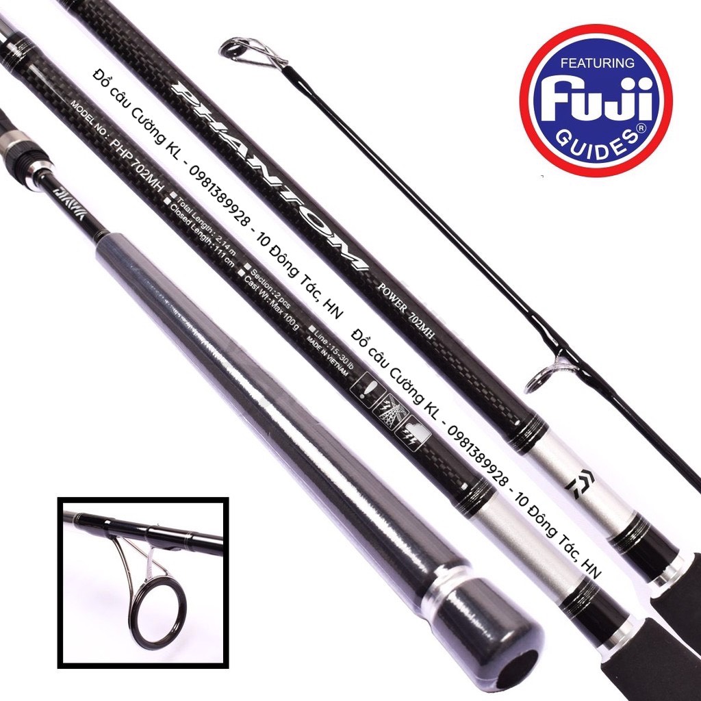 - Cần Lure Phantom Power 902MH | Máy Dọc – 2 Khúc sở hữu chiều dài tới 2m75. Cây cần Phantom Power sở hữu dàn khoen Fuji SIC chân K cực kỳ đẹp mắt, đặt biệt chân K to cho xả dây nhanh hơn khi đánh xa bờ. Khoen Fuji Alconite K không chỉ chống vưỡng mà còn giúp giảm sức căng trên cánh tay người câu. Bên cạnh phôi cabon nhẹ nhàng là pad máy kiểu độc quyền của hãng Daiwa cũng khá đẹp mắt, đặt biệt hơn là cần dòng cá lên đến 40Lbs tương đương hơn 18kg khá chuẩn cho đánh sông hồ. Blank cần với độ cứng MH (không quá cứng) cho cảm giác action và sức mạnh cũng khá tốt.