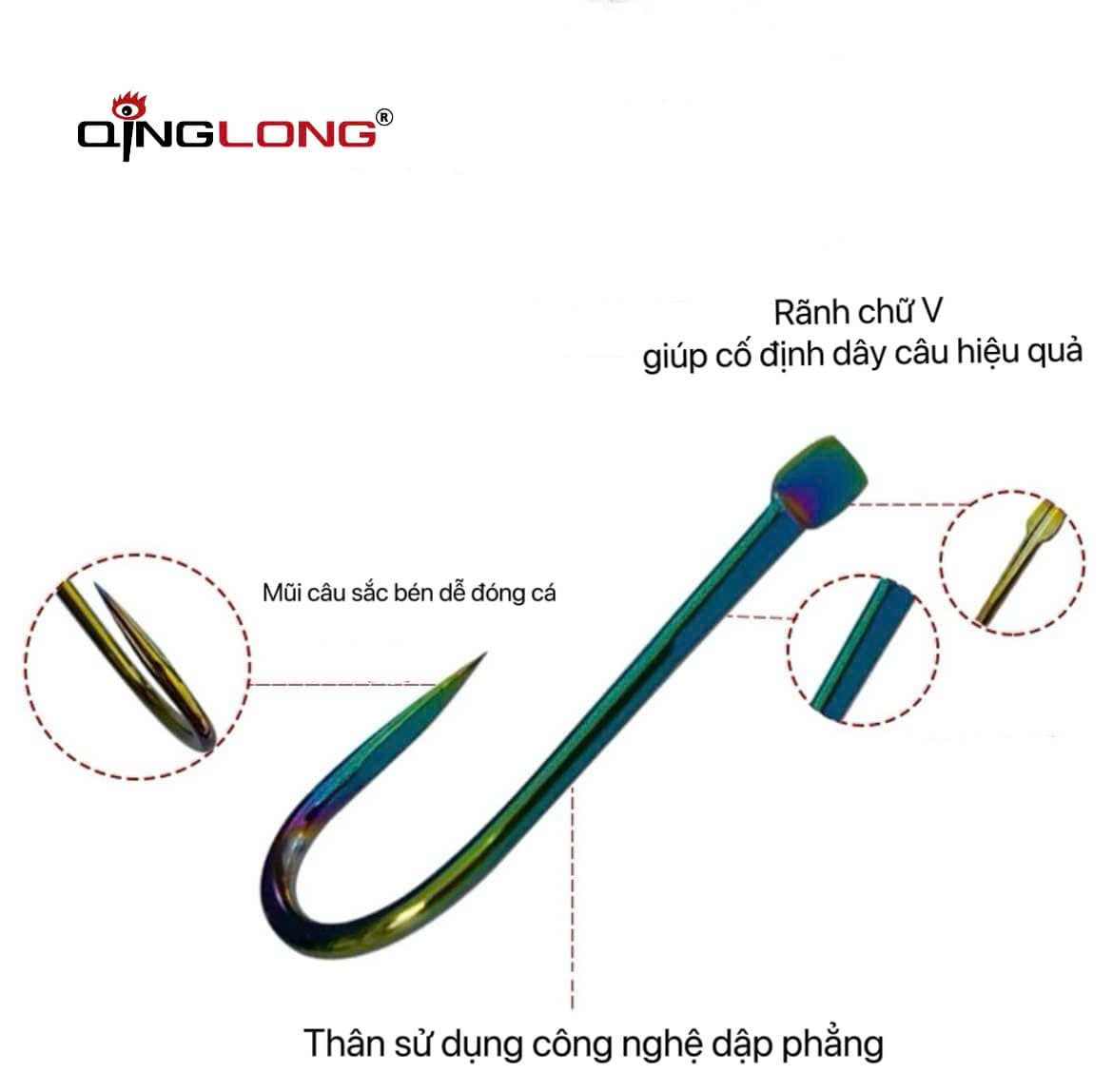 1.Rãnh hình chữ V: Thiết kế rãnh hình chữ V phía trước giúp cố định dây câu hiệu quả và tăng độ bền, việc buộc dây vào lưỡi câu cũng dễ dàng hơn.