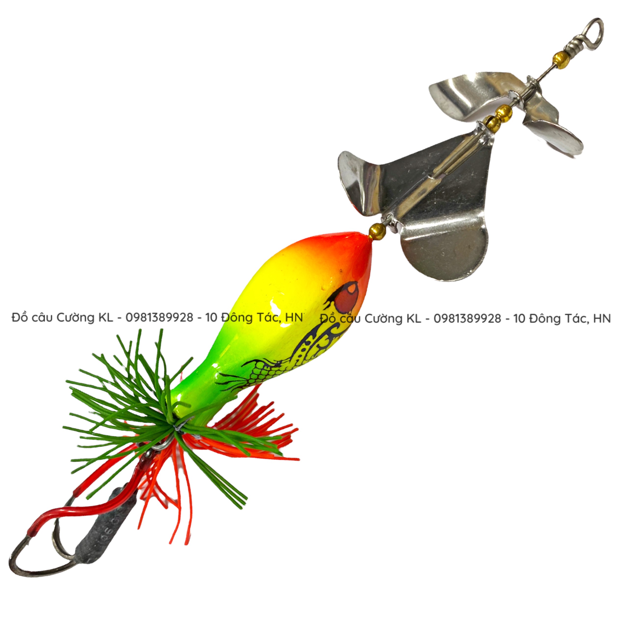 Mồi Lóc Bông Buzz Bait Thailand Handmade 27g Action top water, 2 cánh quạt xoay đánh nước khi bơi, lưỡi chống vướng và tua đuôi màu sắc. Con mồi có khả năng khua nước mạnh, thu hút các con cá săn mồi hung dữ.