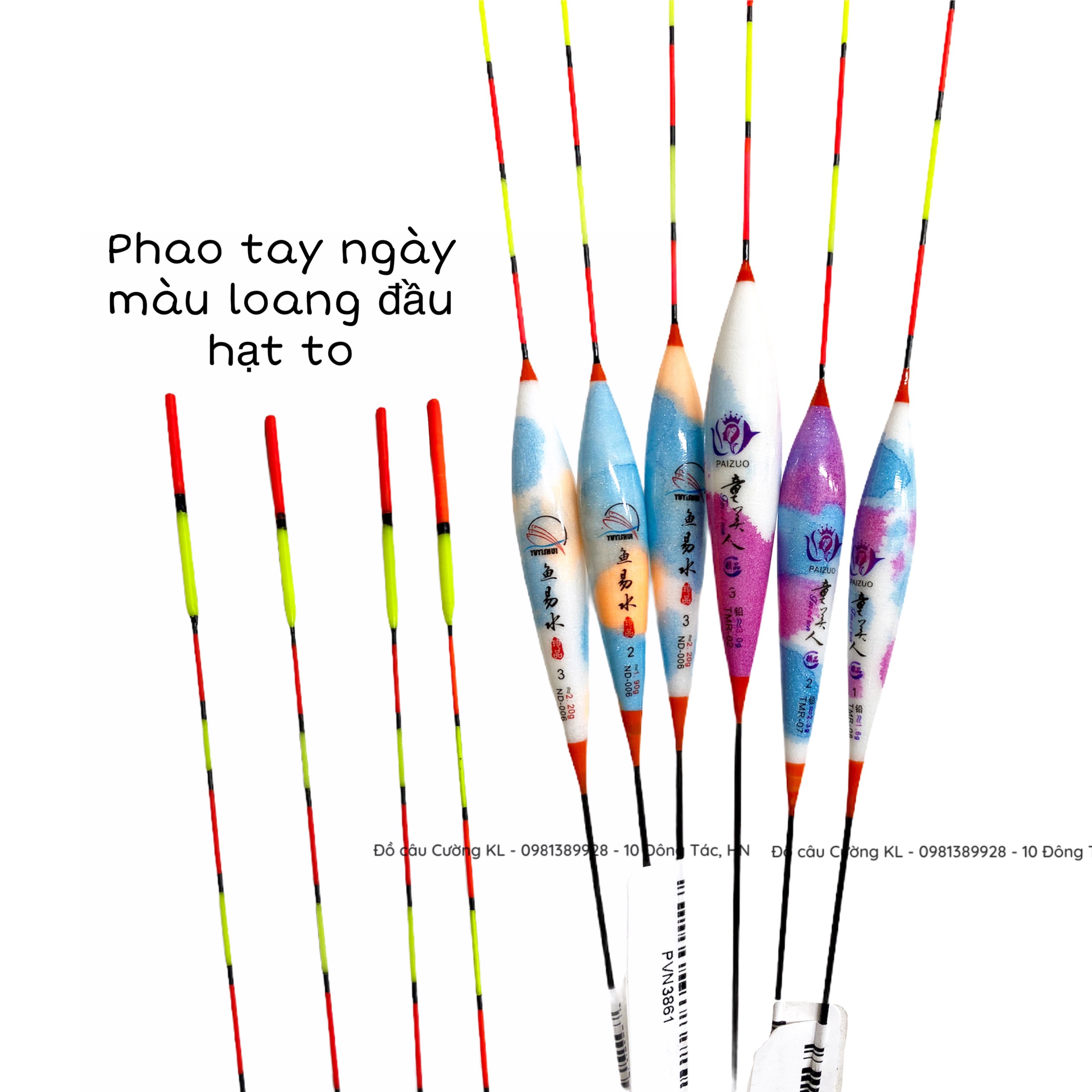 - Phao màu loang đầu hạt to ( tải chì từ 1.6g đến 3g tuỳ số - tải chì có ghi trên thân phao - chiều dài phao: 40-44cm)